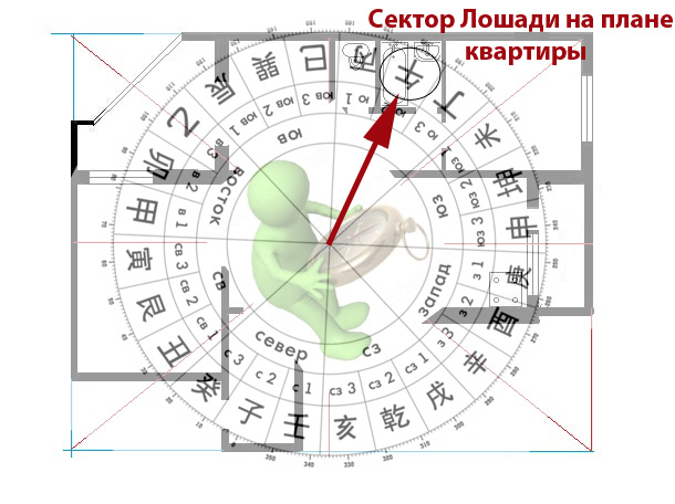 Учитывая, что техники классического фэншуй работают с энергиями пространства, логично предположить, что и символическая звезда имеет свое символическое отражение на плане квартиры. Собственно, она занимает тот сектор, по кольцу 24 гор, который соответствует животному, являющимся “Персиковым Цветом” для человека.