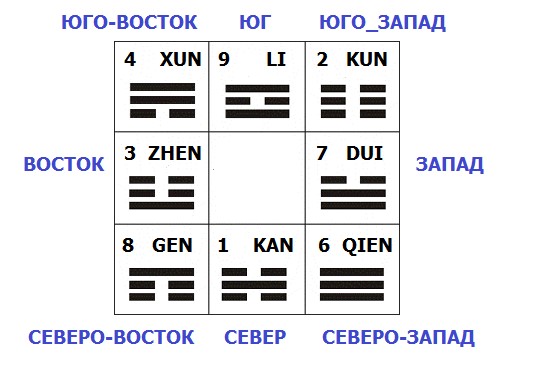 Направления – 45 градусные направления: Север, Юг, Восток, Запад, Северо-восток, Юго-запад, Юго-восток и Северо-запад, которые мы называем в профессиональной практике фэншуй по названию триграмм позднего неба. Юг мы называем по триграмме Ли, Север называем по триграмме Кань, Юго-запад –триграмма Кунь и т.д. Эти направления мы измеряем у входной двери. Это направление изнутри дома/квартиры наружу. Направление письменного стола – это направление куда мы смотрим глазами. Направление плиты – это то куда смотрит фасад плиты. Направление кровати – это направление изголовья кровати, это то куда смотри Ваша макушка, когда Вы лежите на кровати. При условии, что Вы не лежите по диагонали.