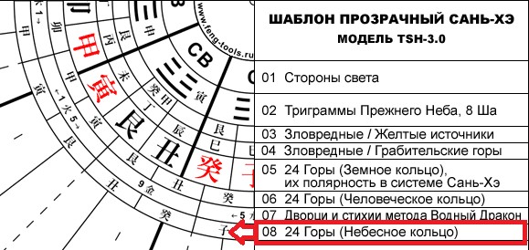 Небесное кольцо — очень важное, оно используется для измерения водных объектов в школе Санхэ. У нас есть кольцо 24 гор самое внутреннее, а это Небесное кольцо – оно самое внешнее и найти его можно только на компасах школы Санхэ или на комбинированном компасе. И если Вам нужно измерять некий водный объект тогда Вы направляете компас на водный объект и смотрите в каком секторе он находится. В этих 3х колцах Земном, Человеческом и Небесном набор иероглифов идентичен. Просто они направлены на разные градусы- смещены относительно друг-друга. Человеческое относительно Земного смещено на 7,50 против часовой стрелки, а Небесное относительно Земного смещено на 7,50 по часовой стрелке.