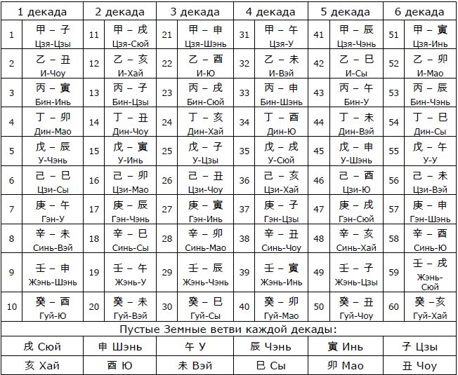 Пустые земные ветви – связаны с 60 Дзя-Дзы. Это две земные ветви в наборе, оставшиеся после сочетания 10 небесных стволов с 12 земными ветвями. На них не хватило Небесных Стволов. Поэтому они называются пустыми. Если мы начнем серию Дзя-Дзы с Дзя –Дзы, Янское Дерево на Крысе, и закончатяся Небесные Стволы на Квэй, Иньской Воде, а 10я Земная Ветвь будет Ю, Петух, и в остатке останутся Ши и Хай, Собака и Свинья. Они будут пустыми в так называемой 1-ой декаде, которая началась с Дзя-Дзы. 2ая декада начнется с Дзя-Ши. Янское Дерево на Собаке. И в этой декаде пустыми будут Обезьяна и Петух. Таким образом, может оказаться, что у Вас часовой столп в пустоте, или годичный столп Вашей карты рождения в пустоте. И тогда определенные факторы, связанные с данным столпом, у Вас находятся в пустоте. Например, пара не может завести детей если часовой столп в пустоте, или не получает человек наследство- если месячный столп в пустоте. Но есть факторы выводящие из пустоты. Не всегда эта пустота вредна. И не все пустые Земные Ветви, которые по табличке пустых Земных Ветвей выглядят как пустые, являются пустыми. Для определения действительно ли пустая Земная Ветвь пустая существуют специальные правила. Поэтому, если Вы видите, что какой-то фактор в Бацзы является пустым – не воспринимайте близко к сердцу все что Вы можете прочитать по этому поводу на каких-то интернет ресурсах. Само по себе это значит не очень много. Я знаю уважаемых мастеров Бацзы, которые достигли вершин этого искусства и которые интенсивно не используют термин пустоты при анализе карт Бацзы. Если они не используют, очевидно и Вам не нужно использовать. Во всяком случае без глубокого изучения этой темы. Когда Вы изучите глубоко, Вы поймете о чем я говорю.