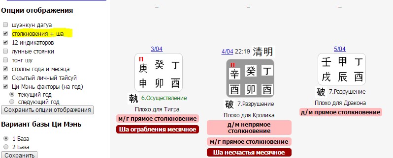 Столкновения и Ша – это факторы которых мы избегаем при выборе дат. Столкновения: не должно быть столкновения – текущей даты с текущим месяцем, текущей даты с текущим годом. Если Вы в калькуляторе www.bazi.biz включите опцию в левом вертикальном меню «Столкновения и ша», тогда все даты, которых следует избегать подсветятся розовым цветом.