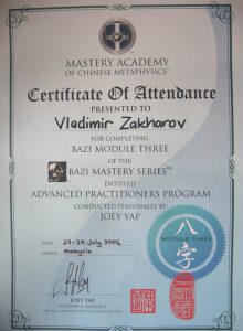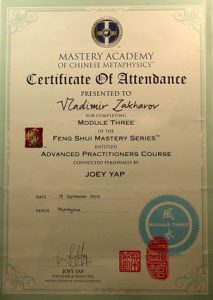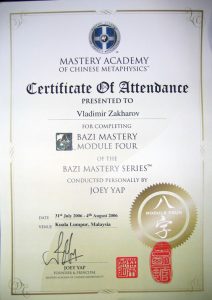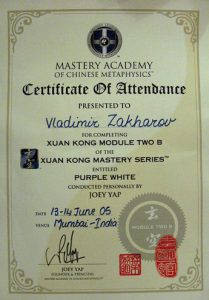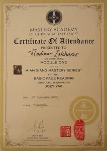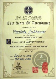 Сначала были простенькие книги, потом — мастера-европейцы. Потом — лучшие из Мастеров Востока. Все профессиональные курсы «Академии Мастерства Китайской Метафизики» Джои Япа, по многим из которых получен диплом «с отличием». Также учился у различных мастеров фэншуй в Сингапуре, Малайзии, Индии, Франции и России.
