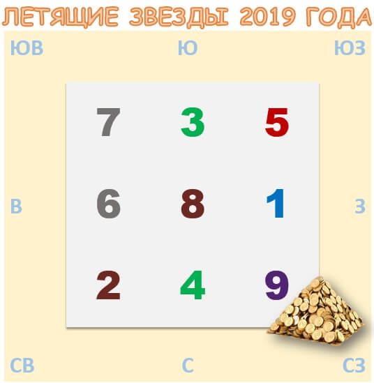 Согласно Лошу Звезда 9 фиолетовая находится в южном секторе, поэтому ее элемент — Огонь. А в 2019-м году 9 фиолетовая будет на северо-западе, поэтому данный сектор в 2019 году будет вторым сектором богатства. Дверь в северо-западной части дома или офиса предвещает благоприятные события, например, продвижение по службе, новые предприятия, начинания и в целом радостные новости. Используя этот сектор, предприниматели расширят свой бизнес, а наемные работники получат повышение. Увеличение прибыли возможно, в частности, благодаря постоянной̆ работе или долгосрочным проектам.